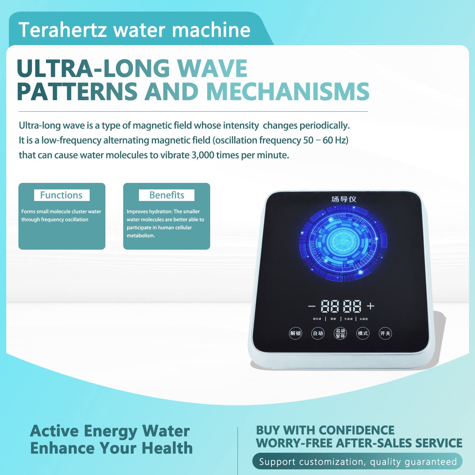Terahertz Energy Life (Structured Water) Device Transform your Daily Water into a Catalyst for Wellness, utilizing Four Synergistic Modes: Ultra-Long Wave, Life Wave, Polar Rotation and Terahertz Waves. This device revitalizes Waters' natural structure to support Hydration, Energy and Cellular function. Making Elite, Structured Water Accessible to Every Household.